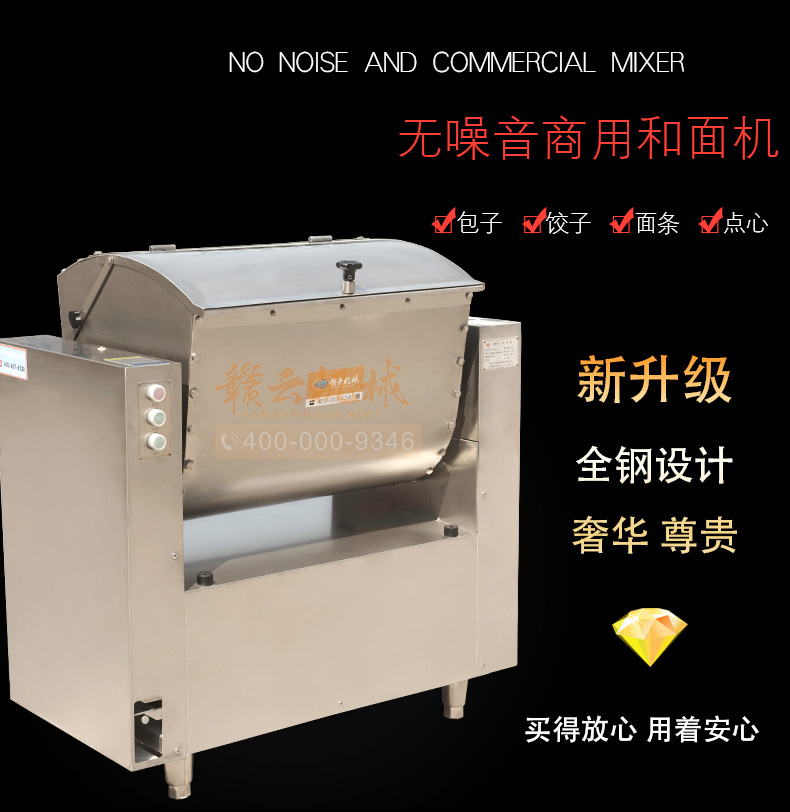 全鋼和面機(jī),工程系列50kg和面郎,整機(jī)外殼不銹鋼材質(zhì),絞龍和和面桶均為食品級(jí)不銹鋼,安全衛(wèi)生,適合中央廚房面點(diǎn)加工,面食加工廠生產(chǎn)和面攪拌之用。本系列產(chǎn)品有25kg和50kg兩種款式